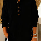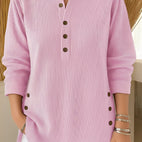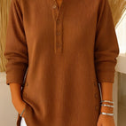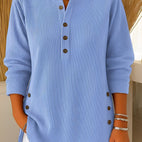 Tento pletený svetr kombinuje měkké materiály s uvolněným střihem. Knoflíky u krku přidávají styl a umožňují různé způsoby nošení. Měkký pletený materiál zajišťuje pohodlí a teplo, zatímco volný střih lichotí postavě. Skvělý pro každodenní nošení, odpočinek nebo pohodlí doma. Díky univerzálnímu designu se snadno kombinuje s džíny, legínami nebo sukněmi.